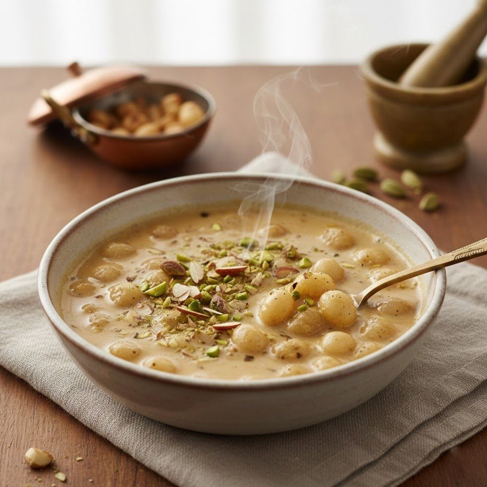 Creamy, smooth, and comforting with tender, slightly crunchy bits of makhana. Naturally lightly sweetened and aromatic, it is easy to eat and soothing for the stomach.
