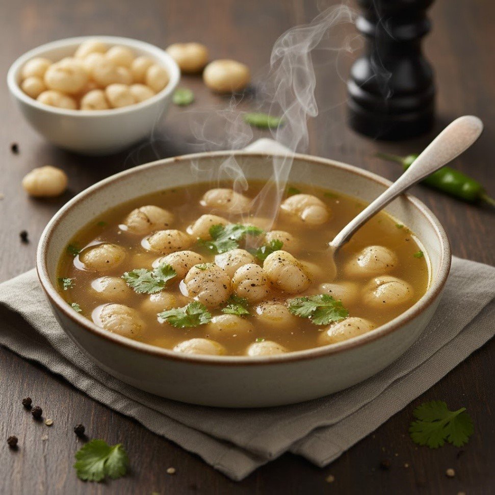 Light, savory, and subtly nutty, with soft pieces of makhana floating in warm broth. The soup is soothing, hydrating, and gentle on the palate, perfect for a light, comforting meal.