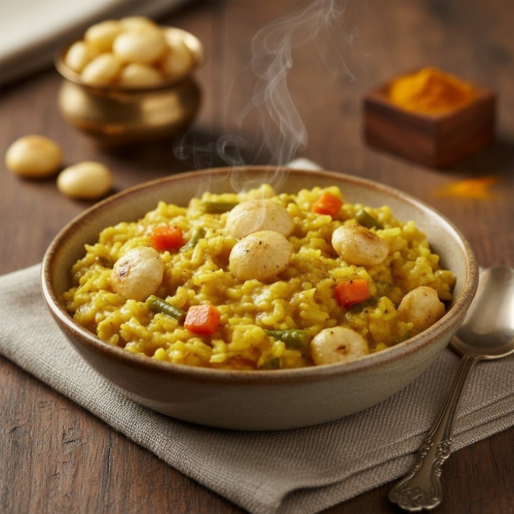 Mild, comforting, and slightly nutty with a soft, porridge-like texture. The khichdi is gently spiced and easy to swallow, while the tender makhana adds subtle crunch and protein, making it a wholesome and satisfying meal.